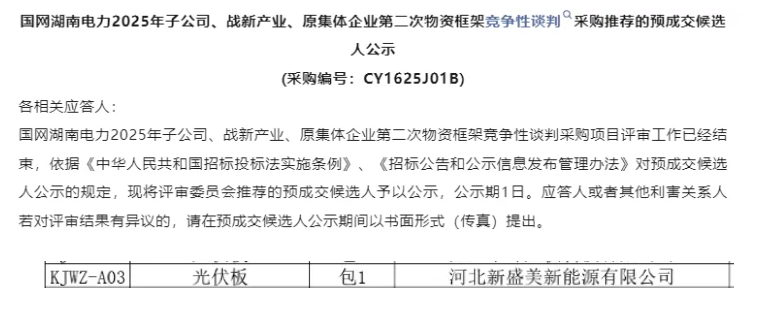 近日,國(guó)網(wǎng)湖南電力2025年子公司、戰(zhàn)新產(chǎn)業(yè)、原集體企業(yè)第二次物資框架競(jìng)爭(zhēng)性談判采購(gòu)入圍結(jié)果公布,新盛美全系列產(chǎn)品入圍其中的光伏組件項(xiàng)目。 該項(xiàng)目建設(shè)單位為國(guó)網(wǎng)湖南省電農(nóng)銀國(guó)際香港董事黃瀾等農(nóng)行領(lǐng)導(dǎo)蒞臨新盛美考