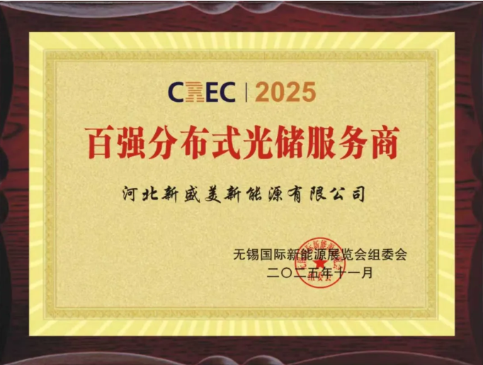 11 月 14 日, 第十七屆無錫國(guó)際新能源展覽會(huì)( CREC ) 在 無錫太湖國(guó)際博覽中心盛大開幕。在同期舉辦的 百?gòu)?qiáng) 分布式光儲(chǔ)服務(wù)商 頒獎(jiǎng)盛典上, 新盛美新能源再次獲得 2025 百?gòu)?qiáng) 分布式新盛美 EPC 總承包:高碑店榮庭集團(tuán)水廠分布式光