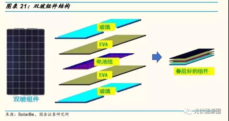 雙玻組件由兩塊鋼化玻璃、EVA 膠膜和太陽能電池片經(jīng)過層壓機(jī)高溫層壓組成復(fù)合層。它包括由上至下依次設(shè)置的鋼化玻璃層、材料層(PVB、PO、EVA 或離子聚合物)、單晶或多晶電池組層、材料層、鋼化玻璃層。