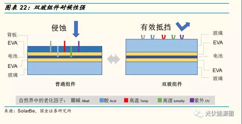 各項(xiàng)性能均改善,適用范圍顯著擴(kuò)大。由于雙玻組件采用雙玻璃壓制而成,其耐候性、發(fā)電效率都優(yōu)于傳統(tǒng)組件,尤其是對(duì)于分布在濕度較高、酸雨或鹽霧較大地區(qū)的光伏電站、農(nóng)業(yè)大棚光伏電站、大風(fēng)沙地區(qū)光伏電站,雙玻組件優(yōu)勢更加顯著: