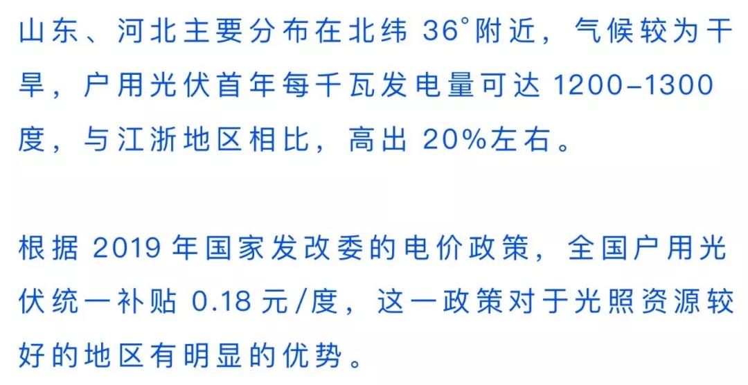 1、山東、河北兩省農(nóng)村老百姓屋頂面積較大,建設(shè)條件較好,可安裝容量相對較大,單位千瓦成本可以降低。